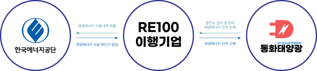 * RE100 이행 기업의 유휴부지를 활용하여 동화태양광에서 태양광 발전소를 설치 및 운영 관리하며 RE100 이행 기업에서 해당 발전소의 전력을 구매만 하면 됨.